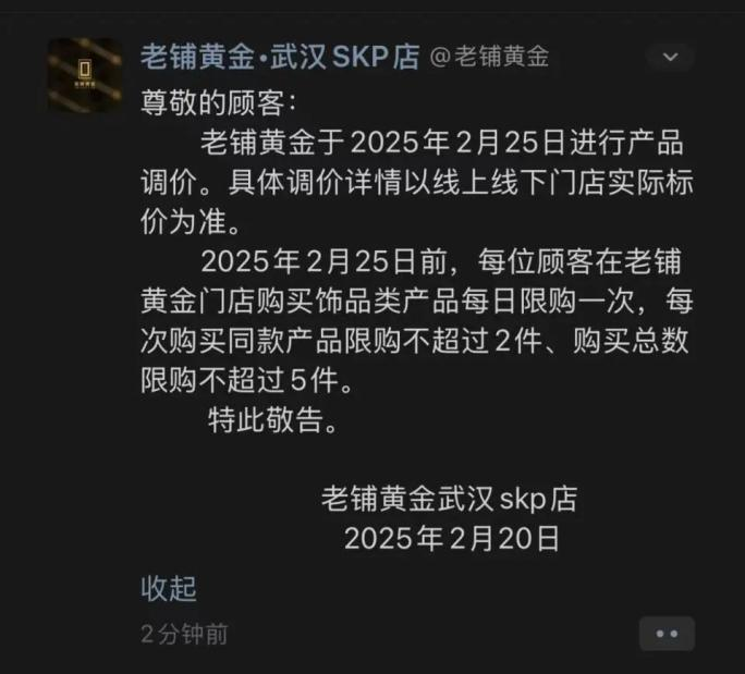 【環球網消費綜合報道】2月20日晚間,老鋪黃金上海豫園店、北京SKP店等發佈公告稱,老鋪黃金將於2025年2月25日進行產品調價。但相關公告並未公佈調價細節,稱“具體調價詳情以線上線下門店實際標價為準”。