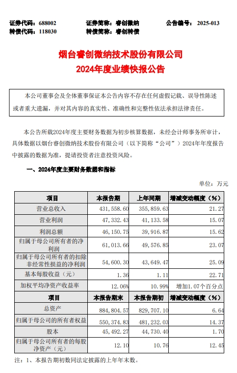 睿創微納2024年業績:營收43.16億元,淨利同比增長23%