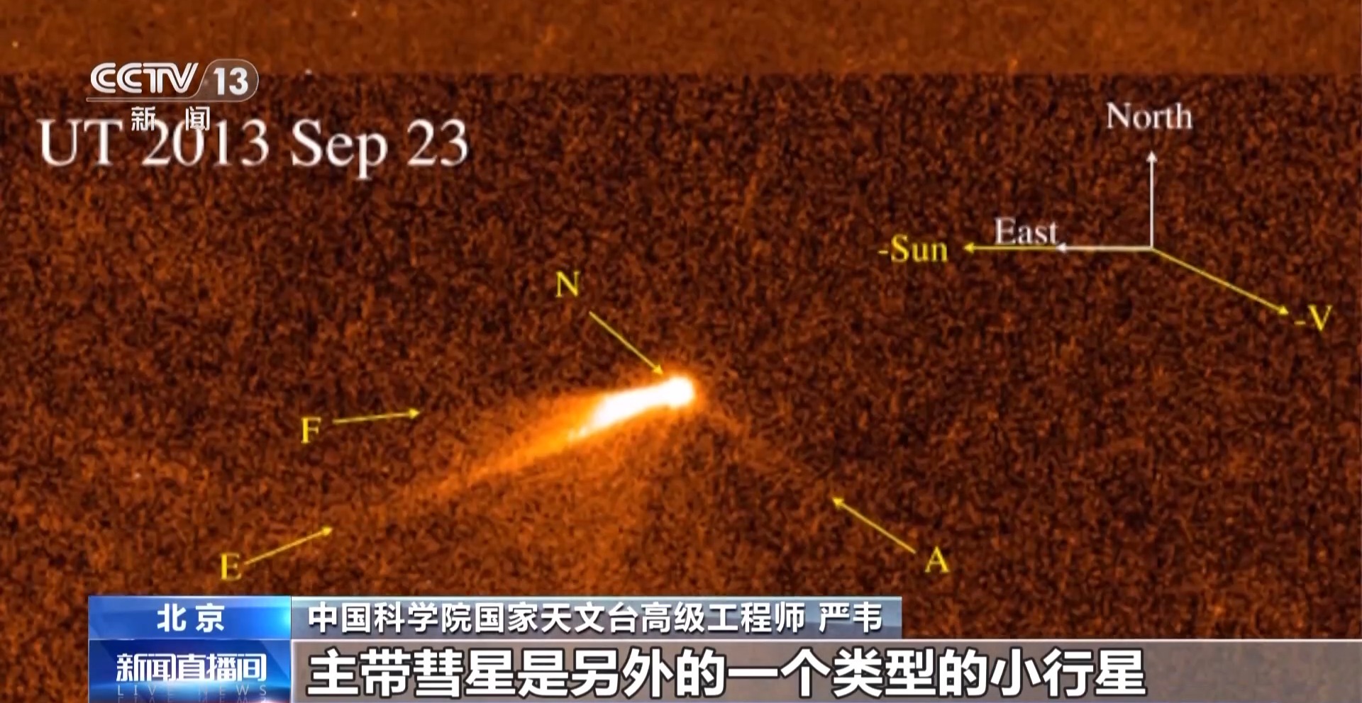*中國科學院國家天文台高級工程師 嚴韋:*主帶彗星是另外的一個類型的小行星,它不是彗星,但是它又有彗星的一些特徵,所以把它叫作主帶彗星,或者是活躍小行星。它可能會在距離太陽比較近的時候,噴發出一些物質,包括氣體、一些顆粒,這也是被觀測到的,也是另外的一個研究熱點。