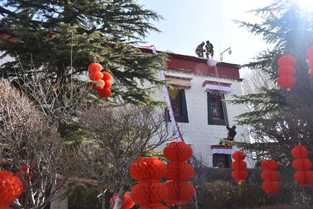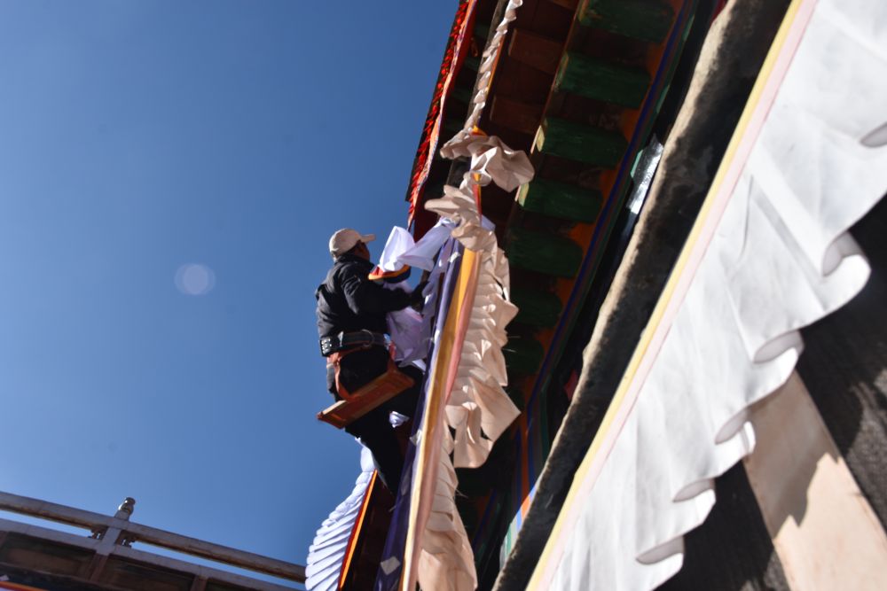 2月28日是藏曆木蛇新年。隨着春天的腳步將近,布達拉宮迎來這場特別的“換裝”儀式——更換“香布”。“香布”是藏式建築的裝飾,通常用五彩棉布縫製,主體為白色,搭配紅藍黃等色的邊沿,對窗沿等的顏料及木構件起到保護作用。