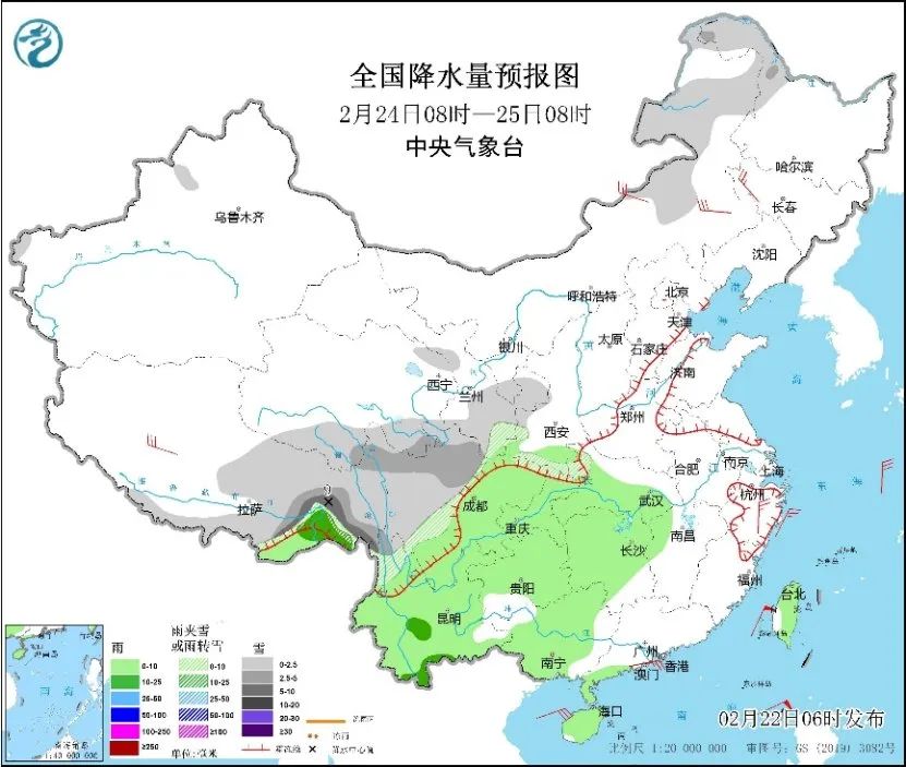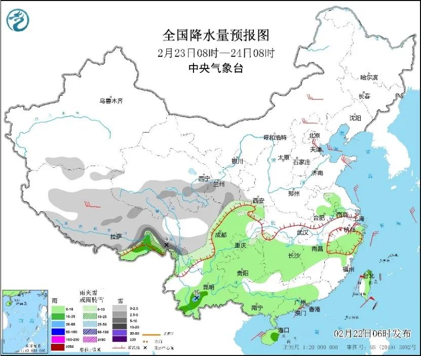 預計今天(2月22日),江南地區等地降雨仍將持續,湖南中部、江西北部、浙江西部、福建西北部及台灣島東部等地有中雨,局地大雨;西藏東部和南部、青海東部、甘肅東部、川西高原東部等地有小到中雪或雨夾雪,局地大雪。