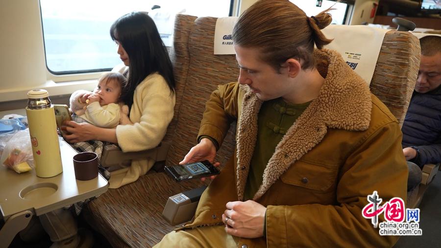 2025年春運期間,旅客在復興號列車上使用手機掃碼自助點餐。中國網發 步楊星/攝
