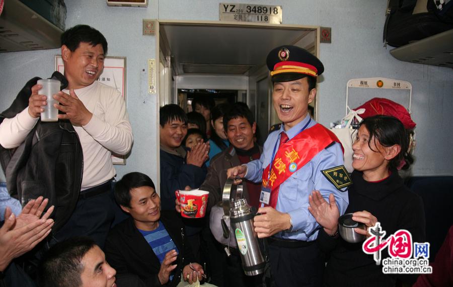 2010年春運,廈門至北京列車乘務員為旅客送熱水。中國網發 南鐵供圖