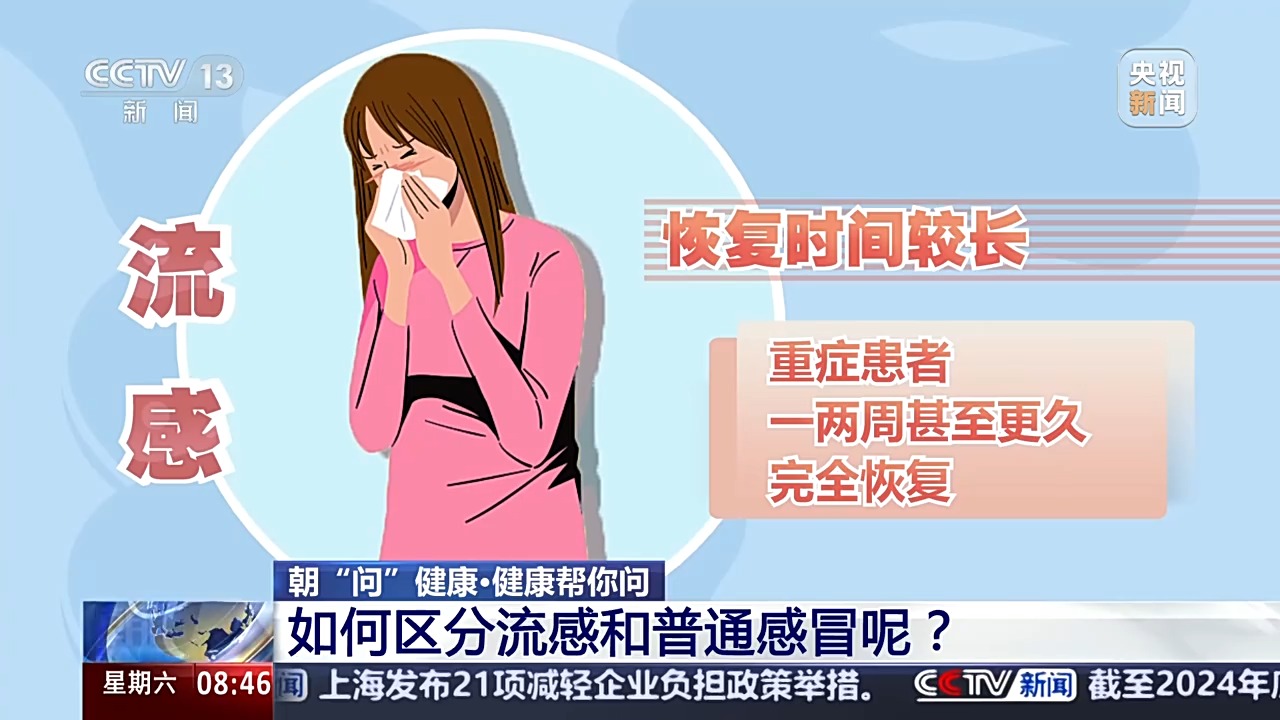 流感的恢復時間較長,重症患者可能需要一兩週甚至更久才能完全恢復;普通感冒通常3至7天就能好轉。