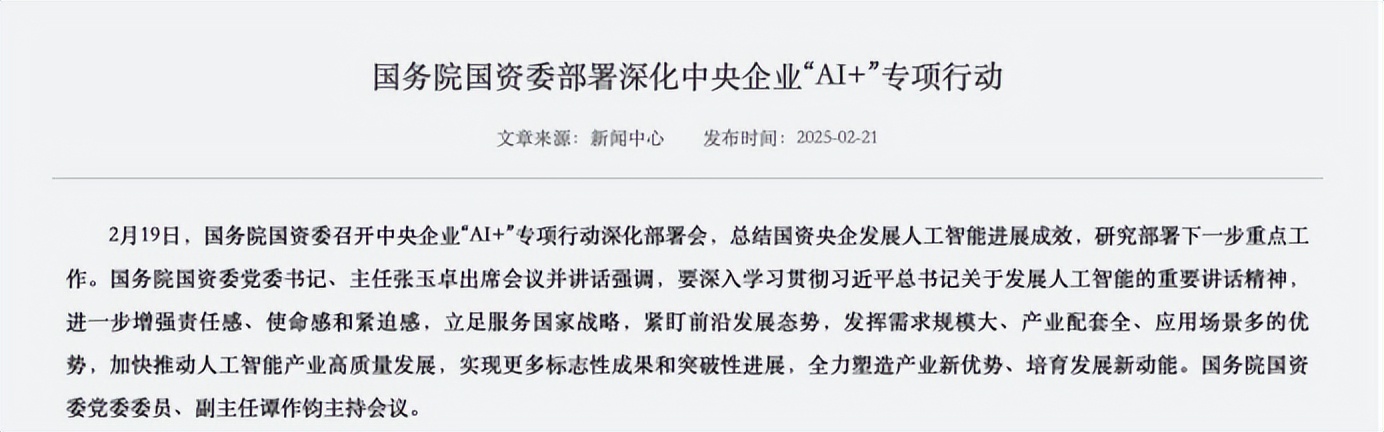 【環球網財經綜合報道】2月21日國資委網站消息,近日國資委召開中央企業“AI+”專項行動深化部署會。會上,國資委強調,國有資本控股企業需緊緊抓住人工智能產業發展的戰略機遇,堅定投入大模型技術的研發。