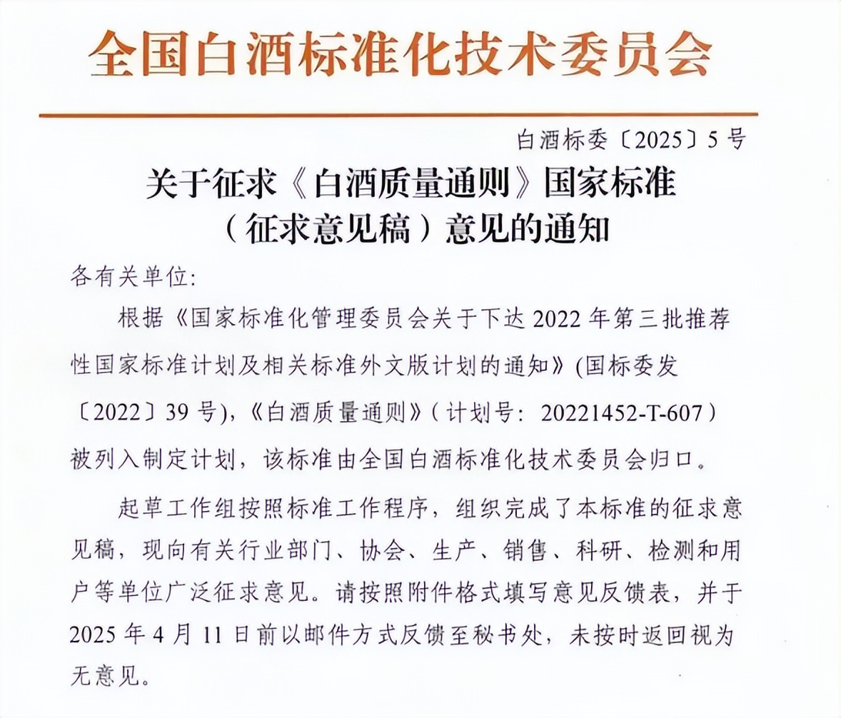 【環球網財經綜合報道】近日,全國白酒標準化技術委員會發布了《白酒質量通則》國家標準(徵求意見稿)的意見通知。該標準旨在從頂層設計出發,提出新的白酒品質表達方式,以建立統一的白酒形象,並推動白酒的國際化進程。