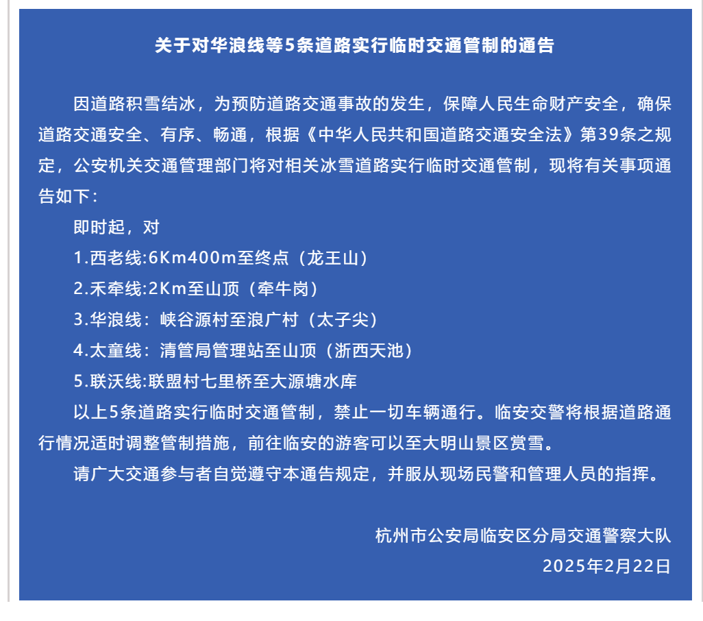 上午10點左右,杭州市公安局臨安區分局交通警察大隊就發佈了對相關冰雪道路實行臨時交通管制的公告,對西老線(龍王山)、禾牽線(牽牛崗)、華浪線(太子尖)、太童線(浙西天池)、聯沃線 等5條道路實行臨時交通管制,禁止一切車輛通行。臨安交警將根據道路通行情況適時調整管制措施,前往臨安的遊客可以至大明山景區賞雪。