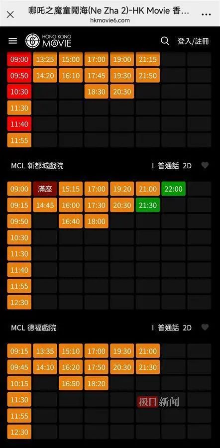 2月21日晚,記者在香港購票平台上搜索看到,《哪吒2》的排片較多,有的影院一天播放超20場。許多場次已經顯示“餘票較少”。其中,上午場的票價較優惠,在50元至80元之間,下午場的票價則多超過百元,但仍吸引許多觀眾購票。
