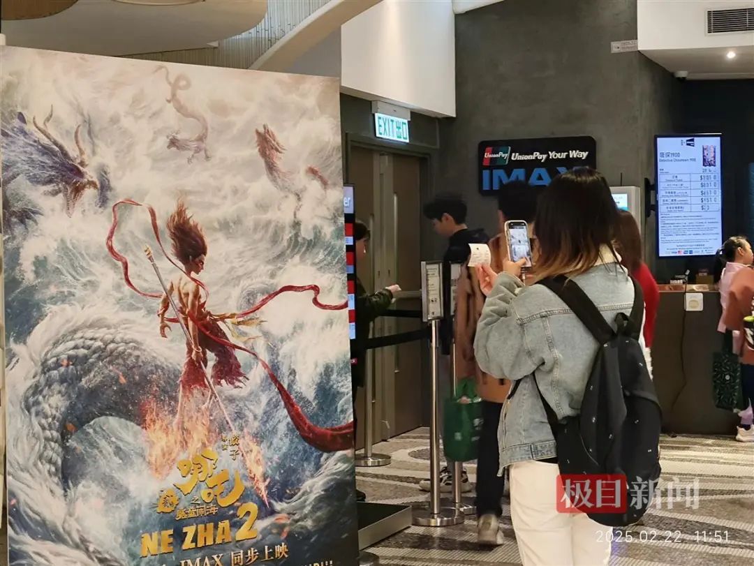 2月22日上午,記者來到位於香港旺角的B+cinema電影院看到,店內佈置了兩米高的《哪吒2》電影立牌,吸引許多觀眾合影打卡。該電影院當天《哪吒2》2D和IMAX排片合計超過20場,上午11時許,觀眾陸續來到影院觀影,檢票處大排長龍。影院工作人員告訴記者,當天《哪吒2》的上座率非常可觀,有不少觀眾前來現場購票。