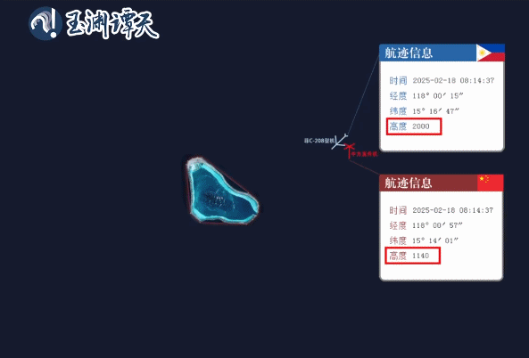 2月18日,菲1架C-208型機非法闖入中國黃巖島領空,多次擅自改變飛行高度,218秒降高920米,以不專業、危險方式,蓄意近距穿越我在空正常巡邏直升機高度層,極易引發海空不測事件。
