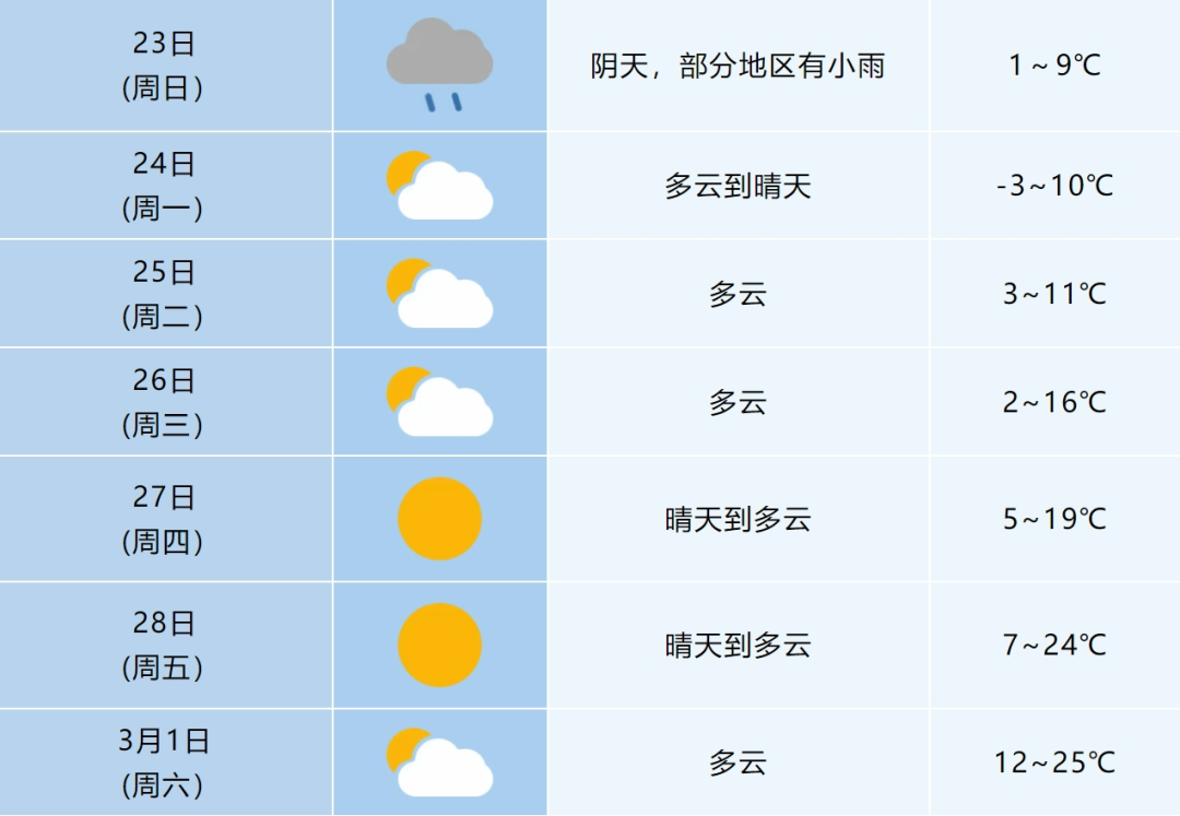 3月1日(週六): 全省多雲轉陰天,江北部分地區有小雨。