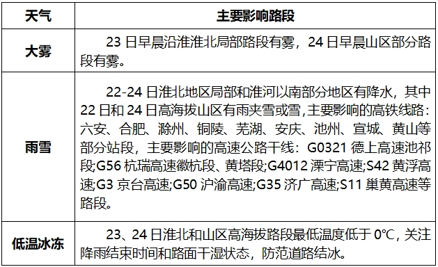 22日(週六): 全省陰天。淮北地區東部有小雨或雨夾雪,淮河以南大部分地區有小雨,高海拔山區有雨夾雪或雪 。