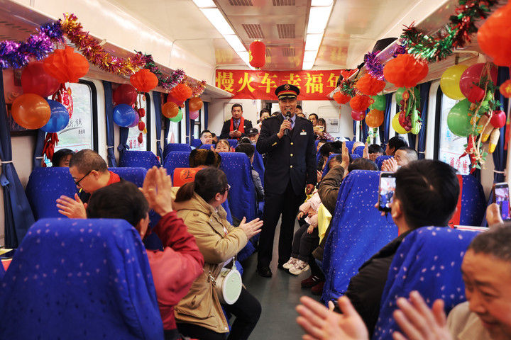春運期間,6063次慢火車為沿線老鄉舉辦新年慶祝活動。新華社發