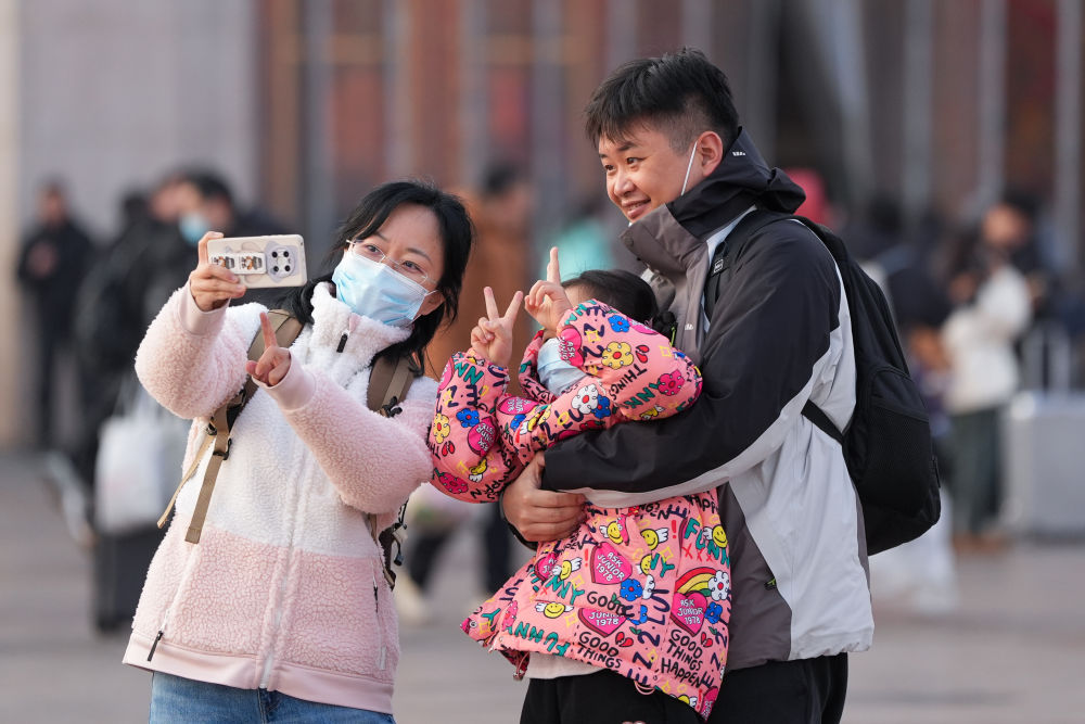 1月24日,一名小朋友(中)在北京站廣場上和家人拍照留念。新華社記者鞠煥宗 攝
