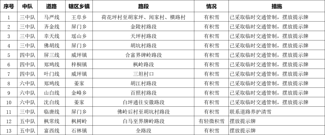 另外,當前杭州淳安已對*王阜鄉荷花坪村至胡家坪、聞家村、橫路村等10個路段實行臨時交通管制,*屏門鄉佛嶺後村至胡坑村等3個路段也有積雪,過往車輛請注意。