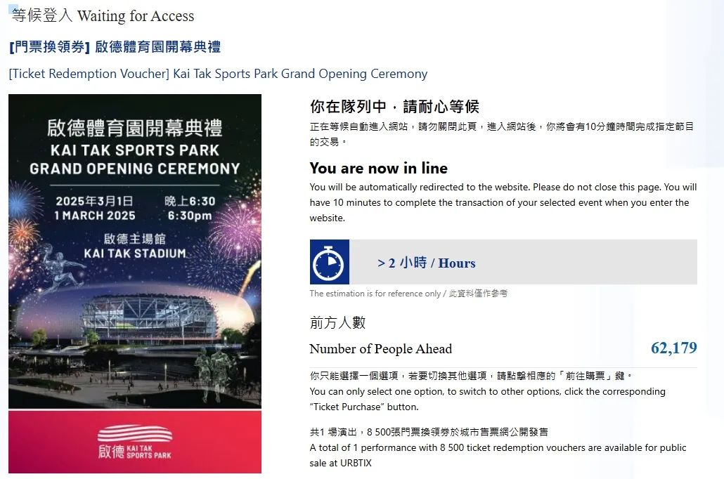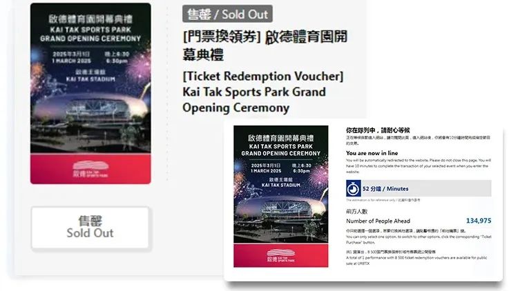 21日早上10時,8500張開幕典禮門票正式公開發售。*據悉,*高峯時13萬人輪候,*僅約半小時就售罄,*場面十分火爆。