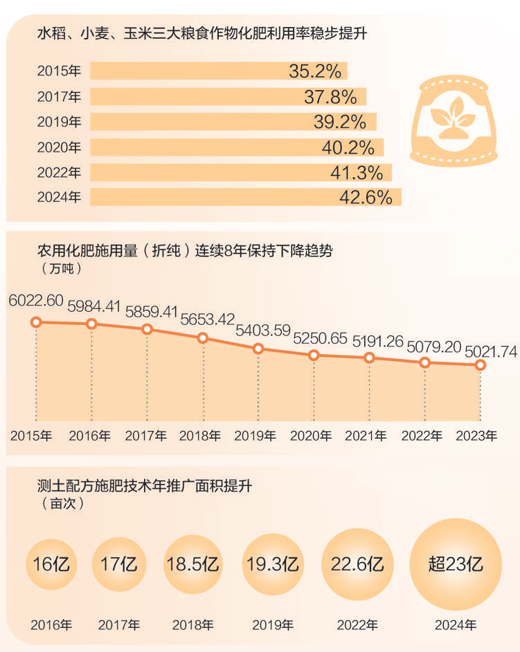 2024年,我國水稻、小麥、玉米三大糧食作物化肥利用率為42.6%,比2022年提高1.3個百分點。化肥利用率,即化肥被作物吸收利用的比例,反映了化肥在農業生產中的有效利用程度。科學施肥效果提升,折射農業發展方式之變。