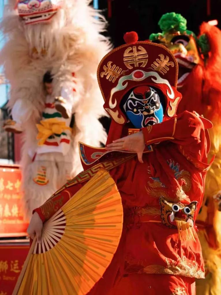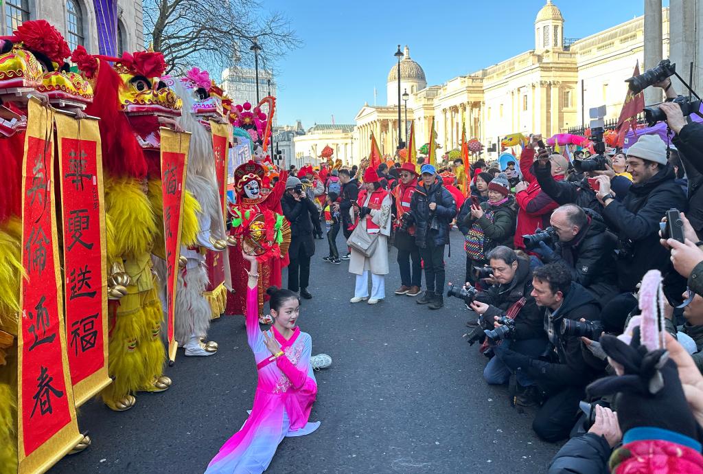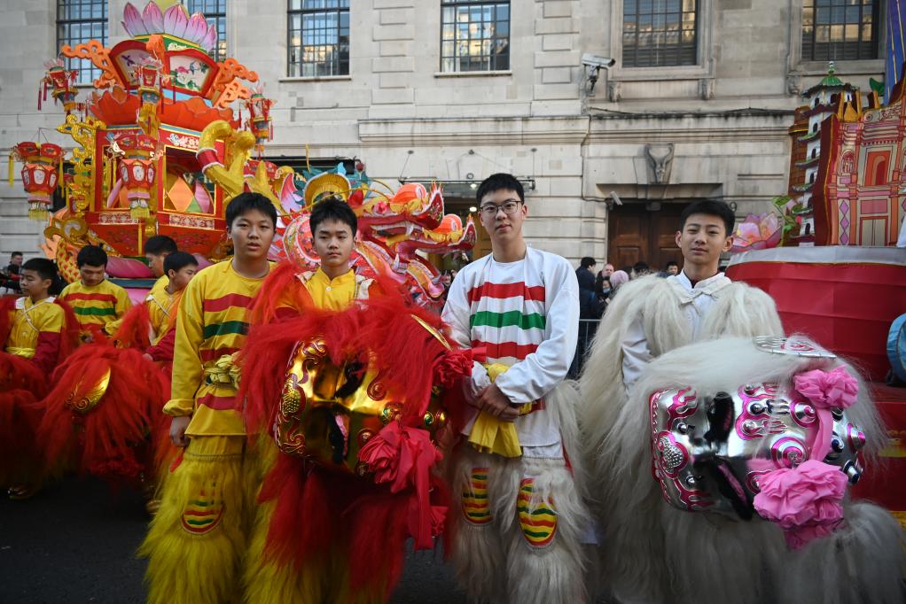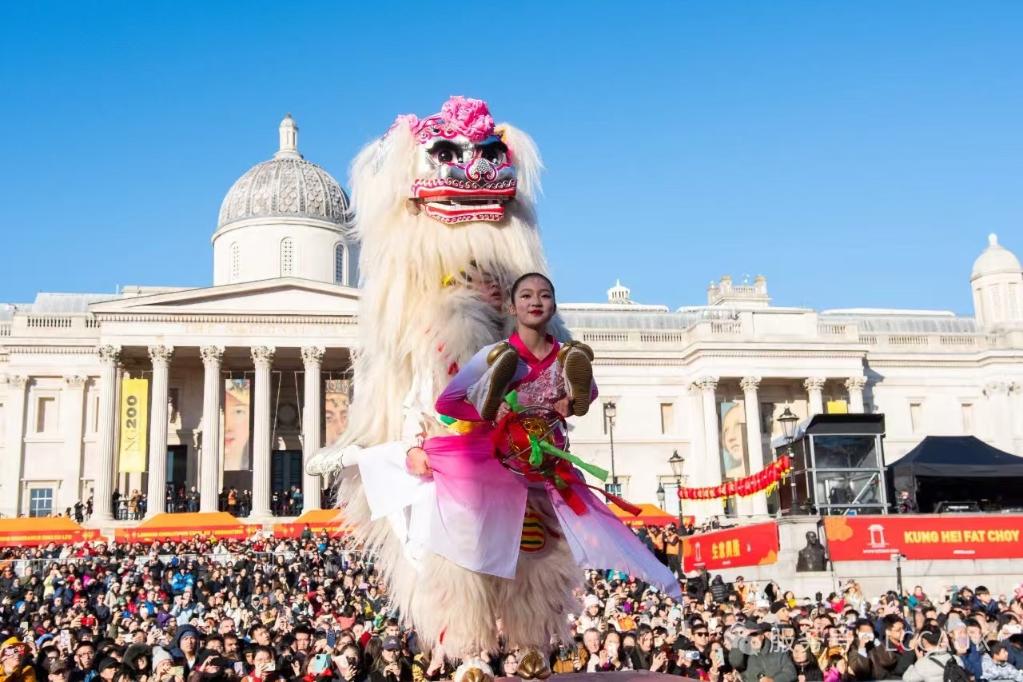 圖為在倫敦舉行的2025年“四海同春”新春文化慶典活動上,朱浩然等隊員們表演“引獅員高台鉗腰獅身旋轉1080度”動作。
