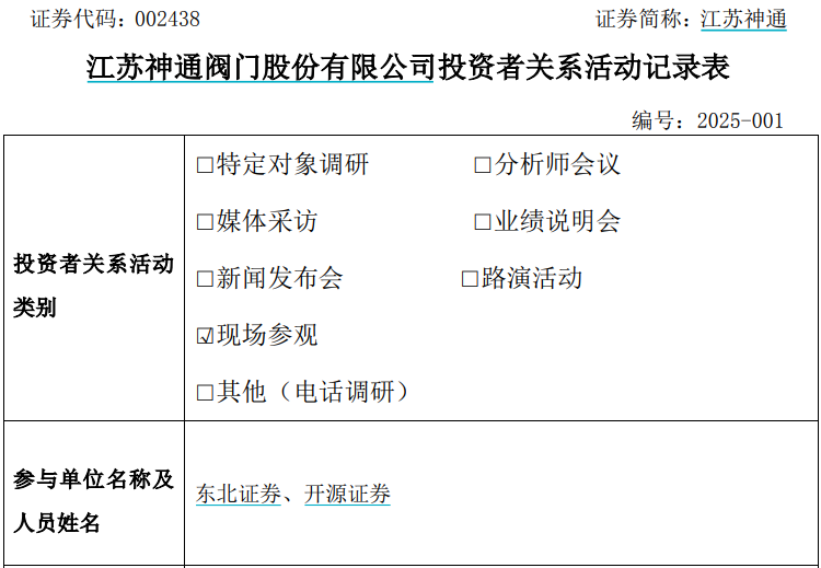 【環球網財經綜合報道】2月22日,上市公司江蘇神通(002438.SZ)發佈了《投資者關係活動記錄表》,披露公司接待了東北證券、開源證券的現場參觀及調研,公司副總裁章其強、證券事務代表:陳鳴迪出席,並接待投資機構代表提問。