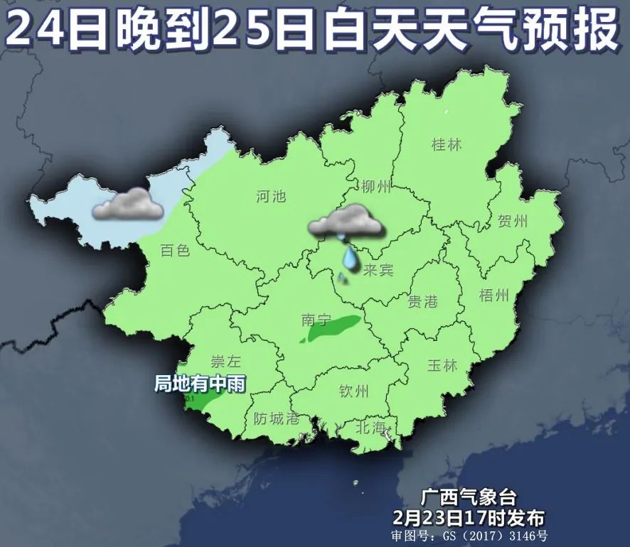 廣西氣象台預計,桂東和桂南地區雨勢較大,將出現小到中雨,局地有大雨。24日至26日,桂中、桂南部分地區日平均氣温低於14℃。其中,24日晚上至25日白天,全區陰天大部有小雨,其中桂南局地有中雨。25日晚上至26日白天,桂東部分地區有小到中雨,局地大雨。