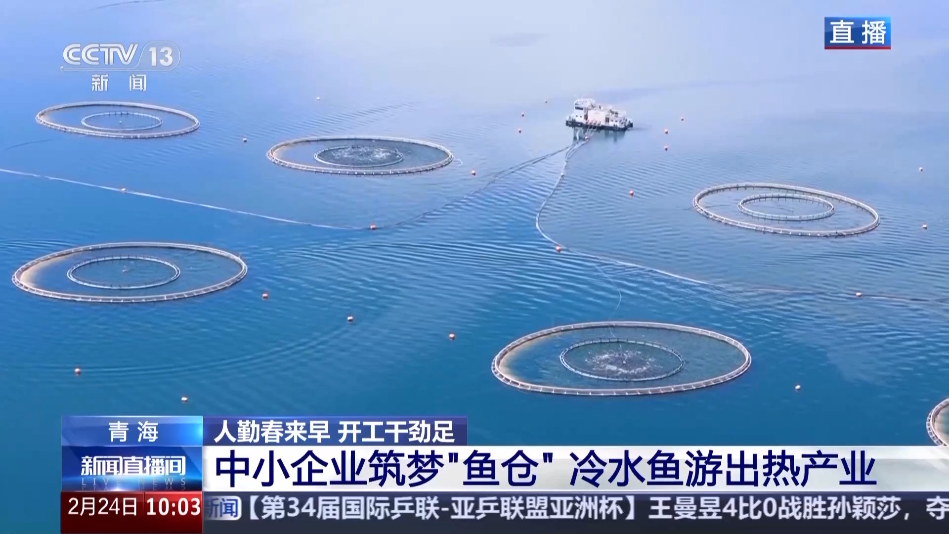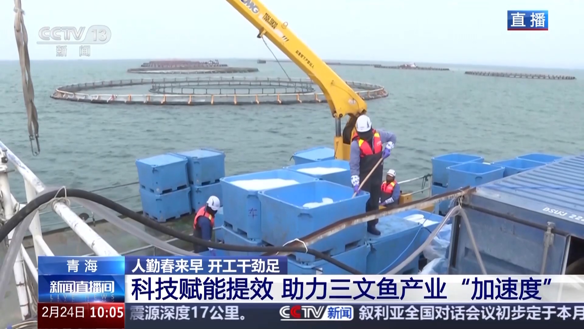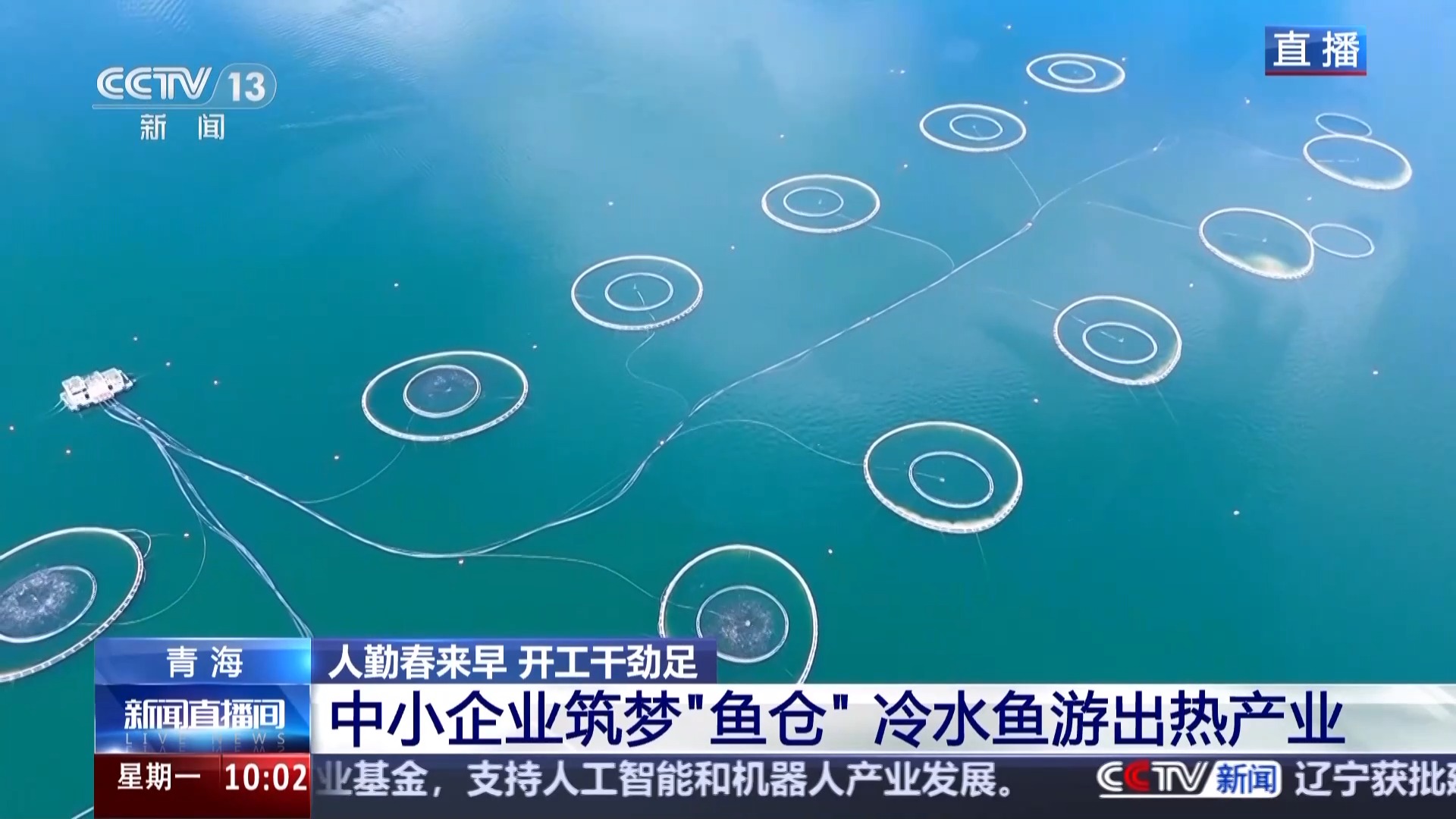 *總枱記者 崔建軍:*此刻捕魚工人們正喊着號子在我身旁的網箱裏進行捕撈作業,這些活蹦亂跳的三文魚每一條大概都有十多斤重,一網差不多有三四千斤。水面上這些大大小小的圓圈,就是當地企業設置的高原冷水魚的養殖網箱,每年有超過1.5萬噸的三文魚被捕撈上岸,發往全國乃至世界各地。在企業看來,青海三文魚之所以能在全球“比拼”,這份底氣來源於當地優質的養殖環境,更來源於先進的養殖和加工技術。