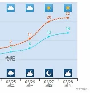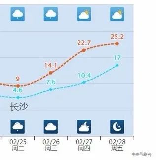 其中,一些城市的升温是“旱地拔葱”式的。長沙25日至27日最高氣温分別為9℃→14℃→23℃,直接一鍵切換到春天模式。貴陽26日最高氣温11℃,27日就升至20℃,一天升幅達9℃。