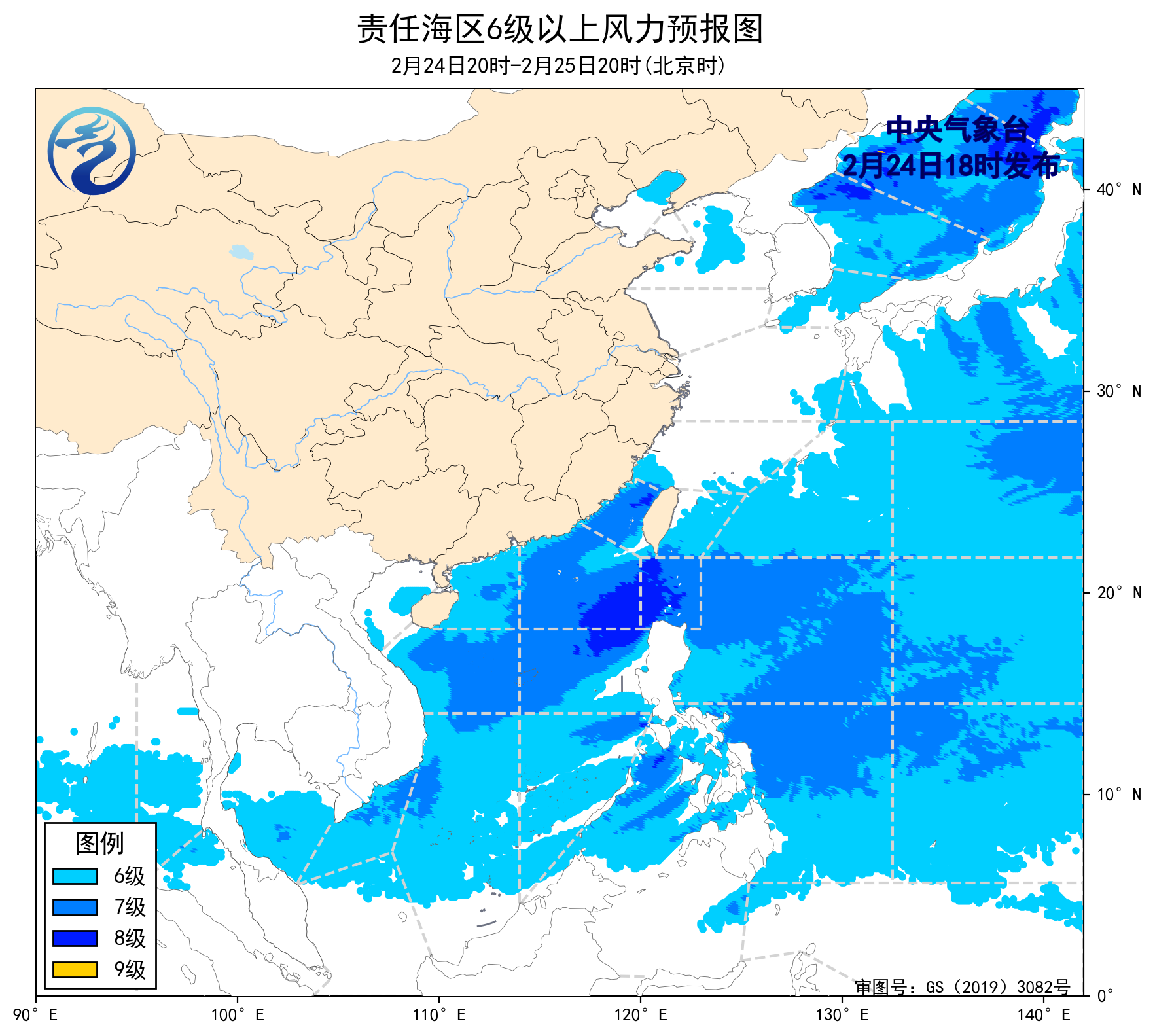 2月24日02時至14時,黃海中部和南部海域出現了5~6級、陣風7級的西北風,東海北部海域、台灣海峽、台灣以東洋麪、巴士海峽、南海北部海域、北部灣、南海中西部海域出現了6~8級、陣風9級的東北風或偏北風,東海南部海域出現了5~6級、陣風7級的偏東風,南海南部海域出現了5~6級、陣風7級的東北風。