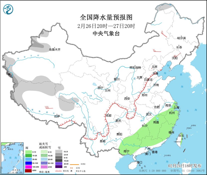 圖2 全國降水量預報圖(2月25日20時-26日20時)