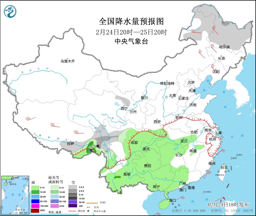 圖1 全國降水量預報圖(2月24日20時-25日20時)