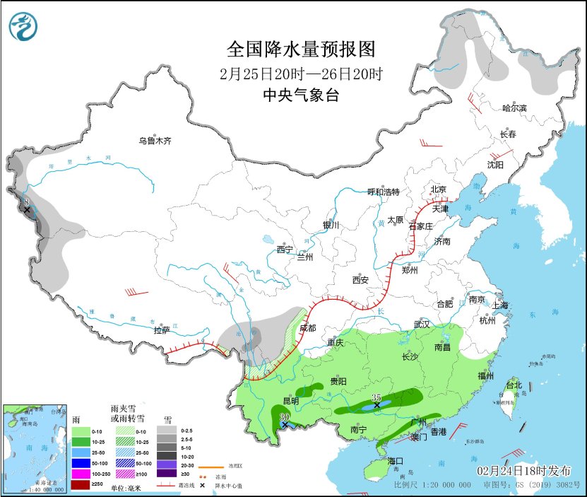 *2月24日20時至25日20時,*內蒙古東北部、黑龍江大部、西藏東部、川西高原中部等地部分地區有小雪或雨夾雪,其中,黑龍江西北部、西藏東南部、川西高原中部等地局地有中到大雪(5~8毫米)。西南地區東部、陝西南部、湖北西部和南部、湖南西部和北部、江西北部、華南中西部、海南島等地部分地區有小到中雨,其中,西藏東南部局地有大雨(25~45毫米)。內蒙古東部、東北地區中西部等地部分地區有5~7級風;台灣海峽、台灣以東洋麪、巴士海峽、南海等海域有6~7級風,陣風8~9級(見圖1)。
