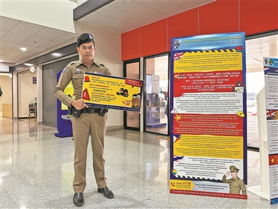 在湄索機場內,一名泰國警察舉着警示牌提醒民眾謹防電信詐騙。
