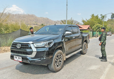 在湄索的一條道路上,泰國軍方設卡檢查過往車輛。