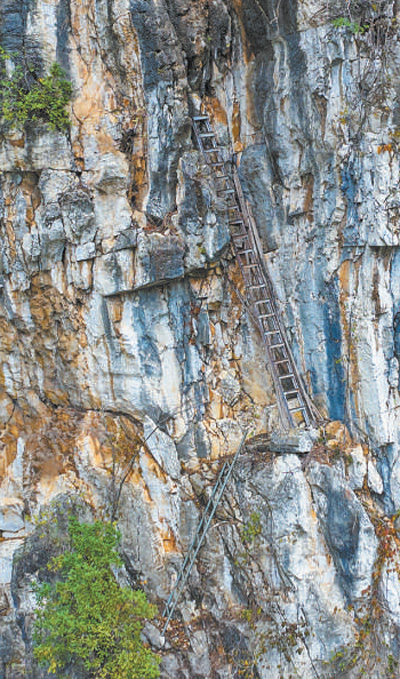 第三條路被村民們稱作“天路”。這是一段垂直高度200米的懸崖峭壁,大約1小時就能抵達山頂,但全程需要沿峭壁攀爬。“爬的時候根本不敢往下看,只有初中的大孩子偶爾會在家長帶領下走這條路。”錢慶輝説。