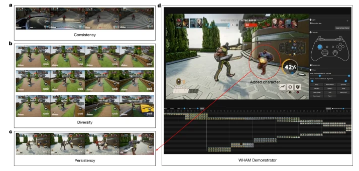團隊隨後開發了名為“世界與人類行動模型”(WHAM)的AI模型。該模型使用了一個3D多玩家戰鬥模擬器中的人類玩家體驗進行訓練。團隊發現,WHAM或能設計出符合預存在機制的複雜3D電子遊戲序列,其關卡設計具有明顯的多樣性,且創意人員可對輸出進行迭代調整。