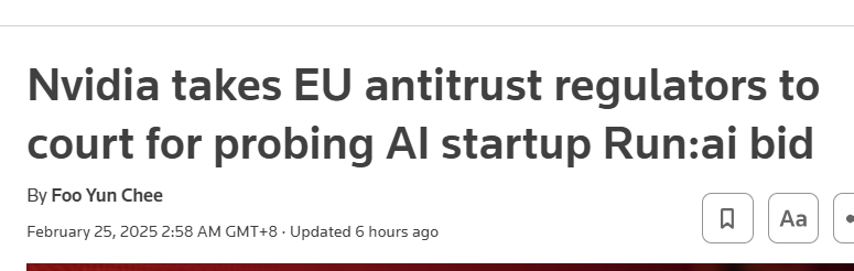 外媒:英偉達起訴歐盟反壟斷監管機構,質疑其對Run:ai收購案的調查