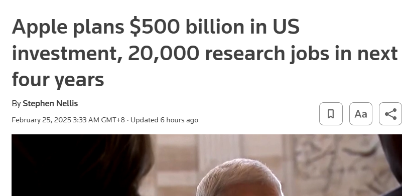 【環球網科技綜合報道】2025年2月25日,據路透社消息,蘋果公司週一宣佈,將在未來四年內在美國投資5000億美元,這一龐大計劃包括在德克薩斯州建造一座大型人工智能服務器工廠,並在全國範圍內增加約20,000個研發崗位。