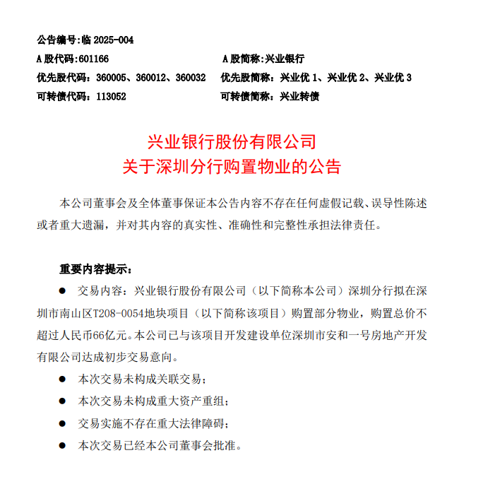 公告顯示,興業銀行已與項目開發建設單位深圳安和一號房地產開發有限公司達成初步交易意向。深圳安和一號註冊資本1000萬元人民幣,經營範圍廣泛,包括以自有資金從事投資活動、房地產開發經營等。此次交易的物業位於建築物底層商業及中高層寫字樓區域,將用於興業銀行深圳分行及集團內各子公司運營管理使用。