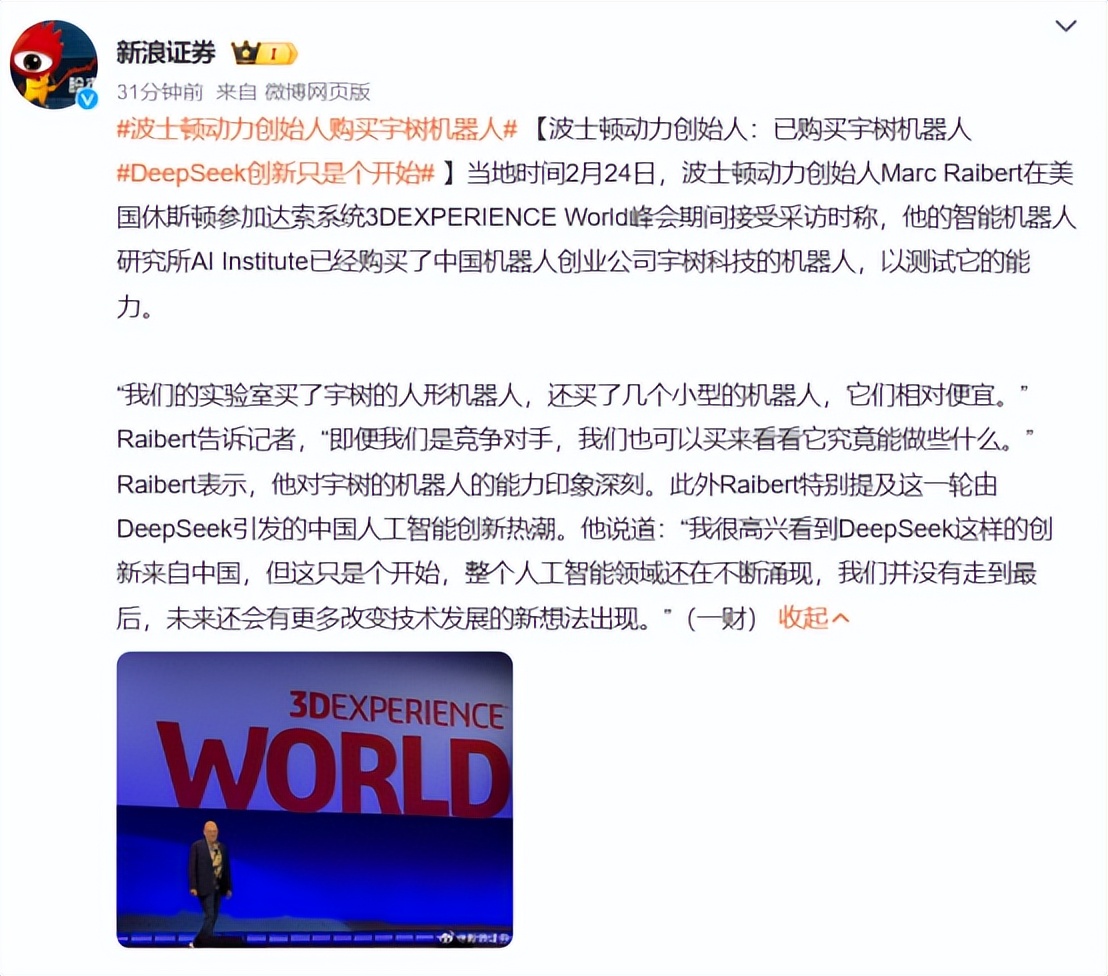 【環球網財經綜合報道】據第一財經報道,波士頓動力(Boston Dynamics)創始人Marc Raibert在當地時間2月24日於美國休斯頓參加達索系統3DEXPERIENCE World峯會期間接受採訪時透露,其智能機器人研究所AI Institute已經購買了中國機器人創業公司宇樹科技的機器人,旨在測試其性能與能力。