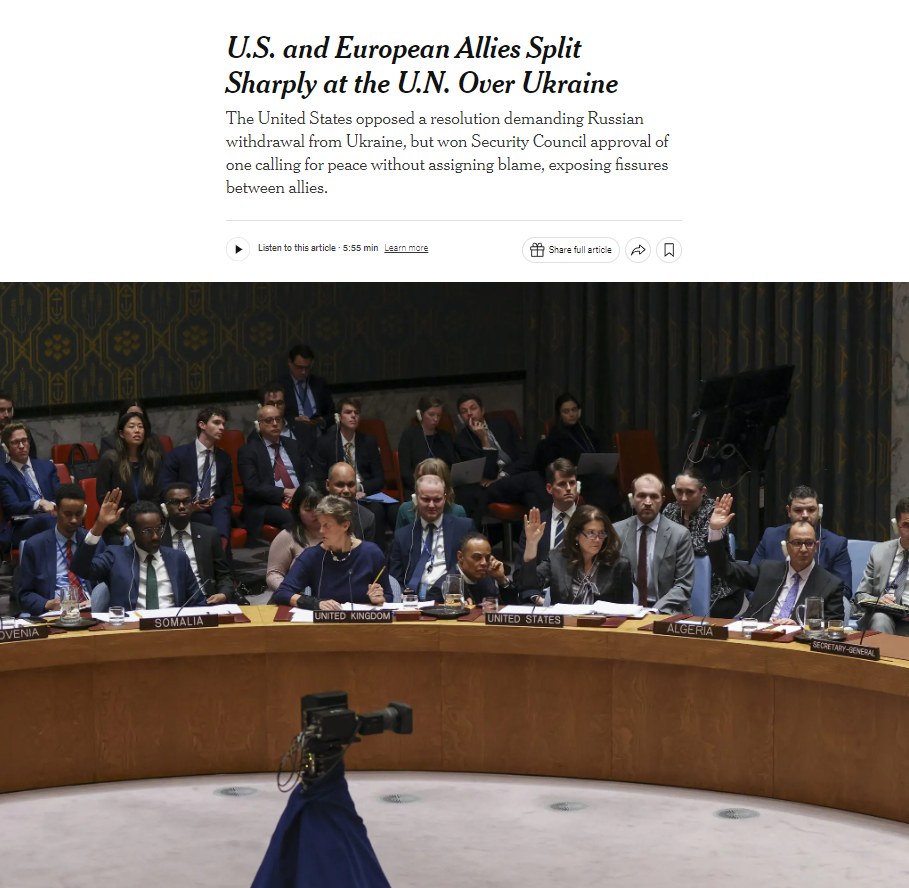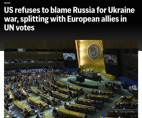 當地時間24日,在聯合國大會關於烏克蘭提起的譴責俄羅斯的決議草案投票中,美國罕見沒有和歐洲保持一致,而是和俄羅斯一同投下了反對票,反對譴責俄羅斯“入侵烏克蘭”的説法。美國《華盛頓郵報》、美聯社等媒體評論稱,美國的做法震動了西方各界,此舉是美國和歐洲傳統盟友之間的“重大分裂”。
