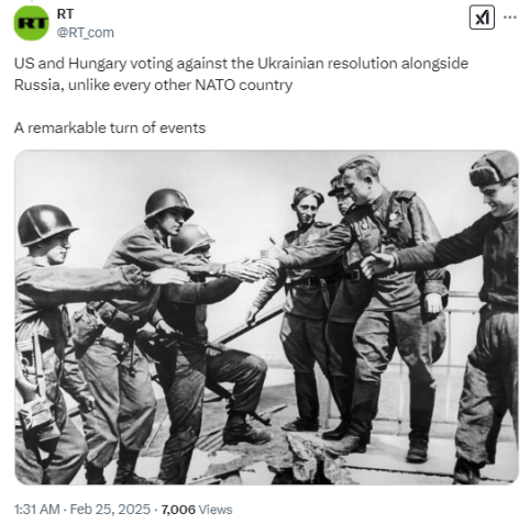 RT還為這則帖子配了一張“美蘇易北河會師”的歷史照片。1945年4月25日,分別在東西兩線對納粹德國作戰的美國和蘇聯軍隊,當天在德國易北河畔的托爾高進行會師,該照片是美蘇合作以及法西斯陣營瀕臨崩潰的重要象徵之一。