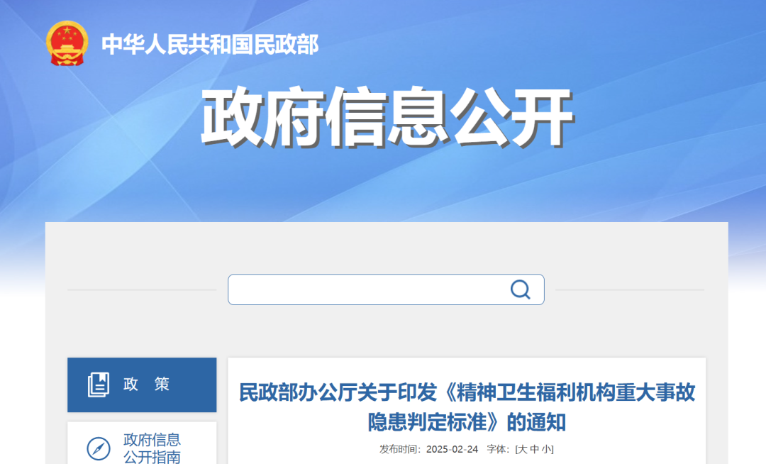 近日,民政部辦公廳印發《精神衞生福利機構重大事故隱患判定標準》(以下簡稱《標準》),要求各地民政部門將《標準》作為加強精神衞生福利機構安全管理的重要依據,依法落實重大事故隱患排查治理主體責任,定期組織開展重大事故隱患判定及排查治理工作,堅決防範和遏制重大事故發生。