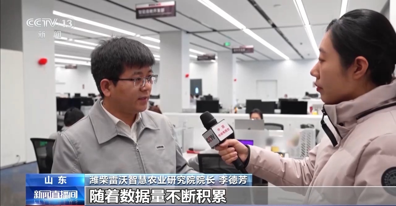 *濰柴雷沃**智慧農業研究院院長 李德芳:*實際上農機變成了一個可移動的智能終端,它上面搭載了各種傳感器,作業過程中去採集各種作業的信息,這些數據到了(AI)模型去做一個融合,這樣的話幫助農機作業更精準。
