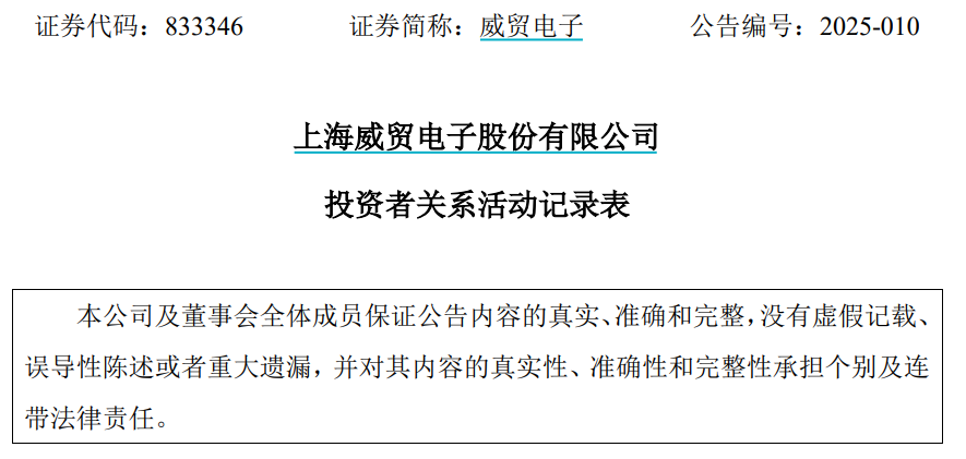 【環球網財經綜合報道】2月26日,北交所上市公司威貿電子(833346.BJ)發佈了《投資者關係活動記錄表》,披露公司接待了華源證券、招商基金、同泰基金等數十家機構調研,公司副總經理、董事會秘書周威迪出席,並解答投資機構代表提問。
