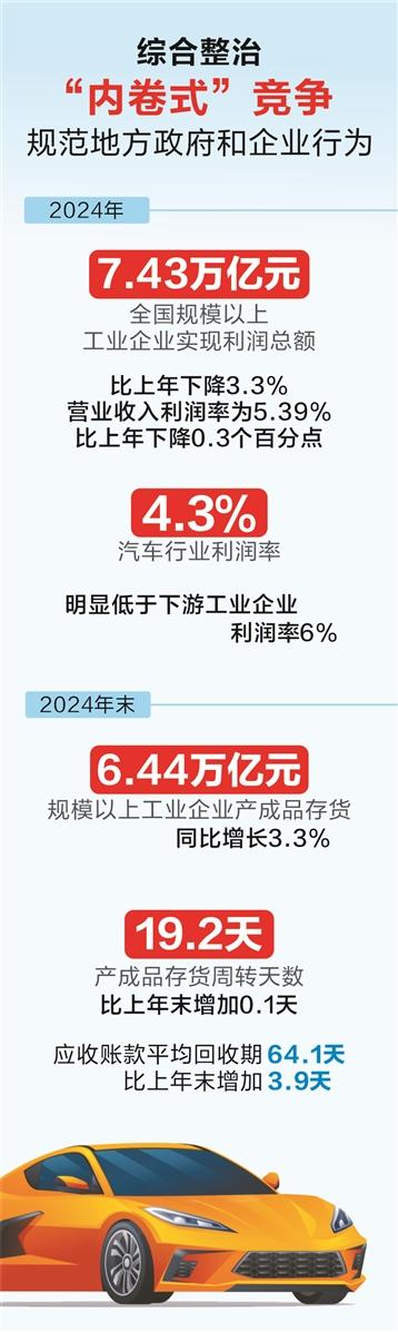 激烈的價格戰導致行業的利潤率大幅下降。中國汽車流通協會乘用車市場信息聯席分會數據顯示,2024年,汽車行業利潤率僅為4.3%,明顯低於下游工業企業利潤率6%的平均水平。事實上,汽車行業只是一個縮影。據國家統計局數據,2024年,全國規模以上工業企業實現利潤總額7.43萬億元,比上年下降3.3%;營業收入利潤率為5.39%,比上年下降0.3個百分點。