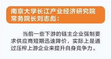 以新能源汽車產業為例,由於整車廠在激烈的價格戰中利潤承壓,為了減少成本,往往會通過各種方式與渠道將成本轉嫁給上游供應商。南京大學長江產業經濟研究院常務院長劉志彪表示,當前一些下游的鏈主企業強制要求供應商短期迅速降價,實際上是通過壓榨上游企業來提升自身競爭力。“更為嚴重的是,許多下游巨頭長期拖欠上游供應商貨款,長達半年甚至一年以上,利用供應商的流動資金支持自身的低成本擴張,這種做法對許多中國供應商企業造成了致命打擊。”劉志彪説。