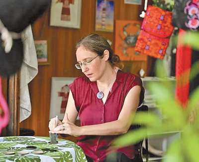 謝敏來自美國芝加哥,曾是一名英語老師的她,如今稱自己為設計師、小店店主。謝敏的小店叫“海島樂趣”,位於海南海口白沙門公園內。“這是五指山市的黎錦手提包,這是保亭村子裏的織品,那幾件是東方市的。”店裏擺放的黎錦作品出自海南各地村民之手,謝敏如數家珍。店中還有不少她親手設計和製作的文創產品,靈感都來自魚、烏龜、閃電等傳統黎錦紋樣。