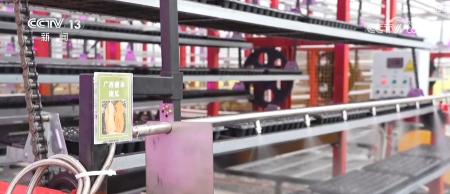 這種智能育秧苗牀採取循環運動的方式,育苗盤會在苗牀軸輪的帶動下,勻速上下移動,均勻接受光照和水霧。