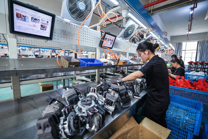 2024年8月14日,在浙江省金華市金東區曹宅鎮的浙江托馬斯工具製造有限公司數字化車間內,工人在流水線上生產出口的園林機械。近年來,金華市金東區大力推動數字化改造,聚焦智能家居、電動(園林)工具等主導行業,以場景應用帶動“智改數轉網聯”項目建設。新華社記者 徐昱 攝