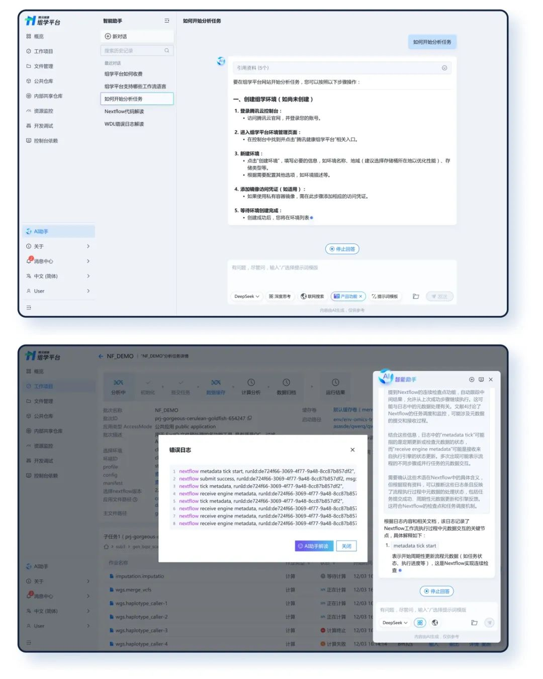 其中,組學平台AI助手深度融合了生物信息學分析工作流開發框架及平台知識庫,提供調試信息智能解析、工作流編寫輔助、產品功能問答等服務,為生物信息學分析提供全流程智能輔助。
