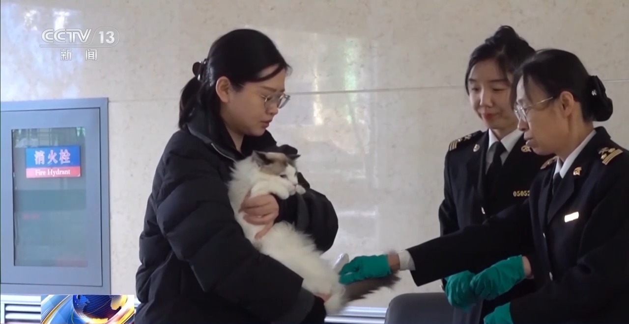 在晉陽海關,市民王雅靜在為她的寵物貓填寫申報信息,海關工作人員核對後,對寵物貓進行檢查,檢疫合格後,寵物即可獲得動物衞生證書,就能跟隨主人出境。